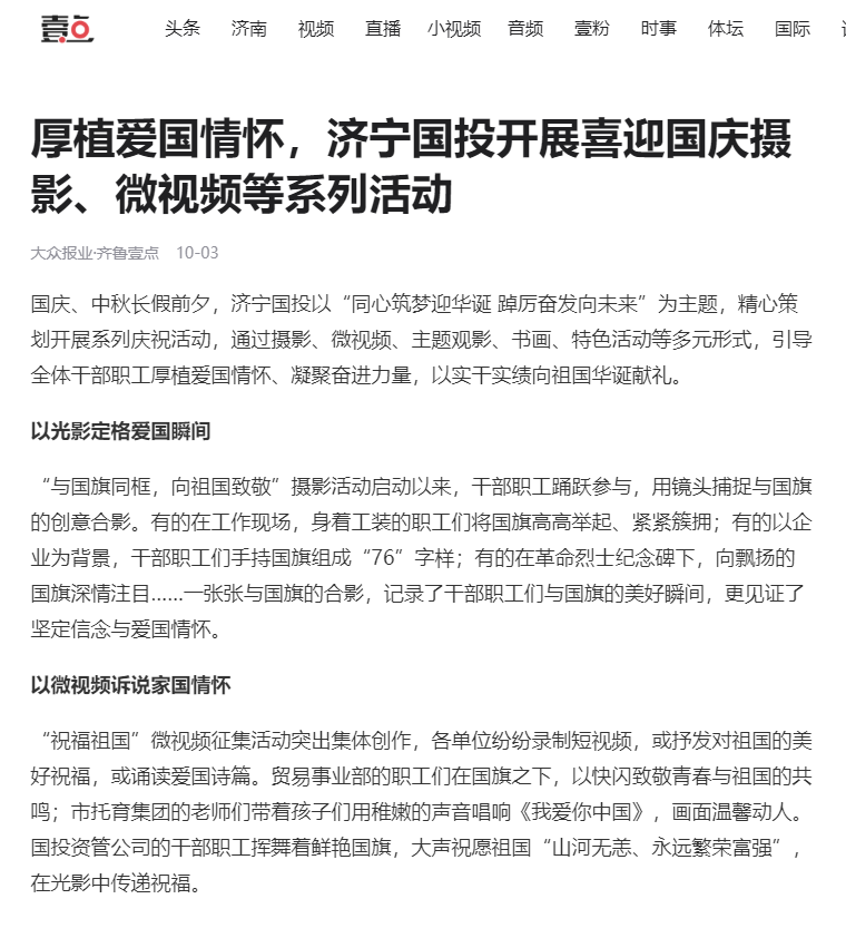 原鏈接:厚植愛國情懷,濟(jì)寧國投開展喜迎國慶攝影、微視頻等系列活動